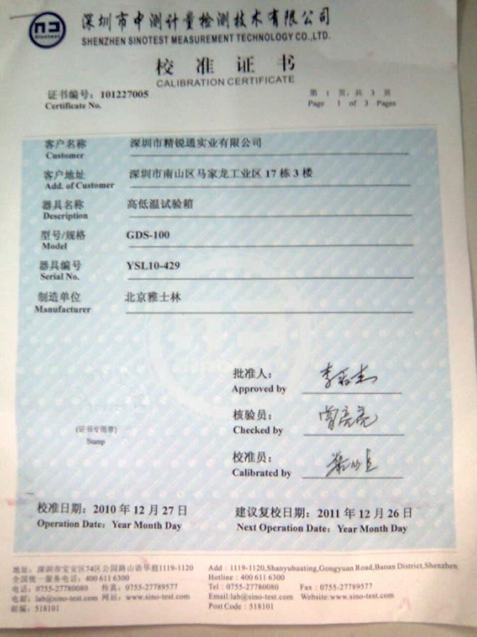>>高低溫濕熱試驗(yàn)箱校準(zhǔn)證書-深圳中測計(jì)量-深圳精銳通